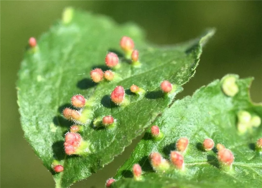 Auf der Blattunterseite, vor allem am Blattrand, bilden sich im Frühjahr anfangs grünliche, beutelförmige Wucherungen (Gallen) von 1 bis 3 mm Größe, die sich zum Sommer hin rötlich verfärben.