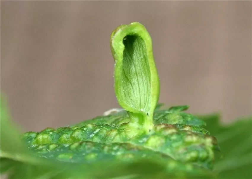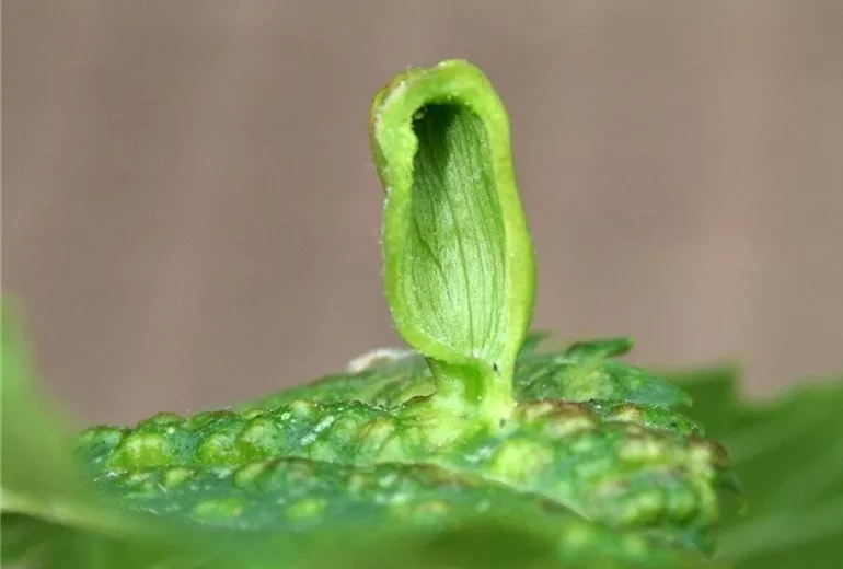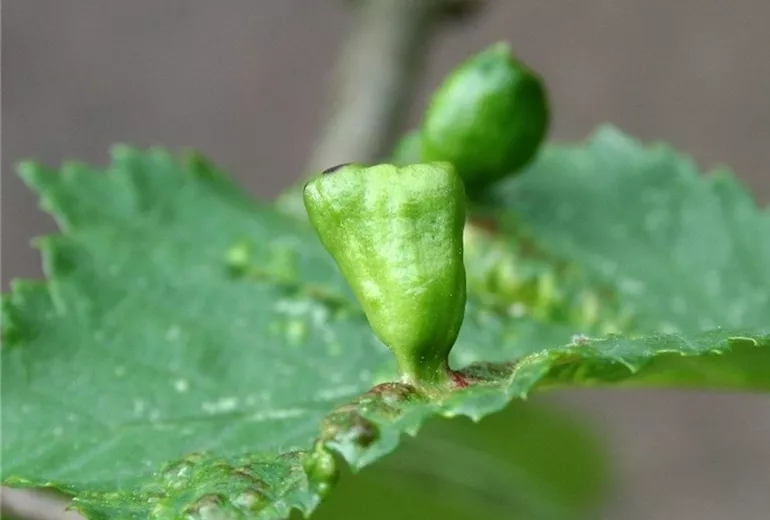 Junge Ulmenblätter zeigen auffällige Deformationen an Blättern. Je nach Blattlausart findet man blasige oder rollenförmige Gallen, in denen sich die grauen Blattläuse befinden.
