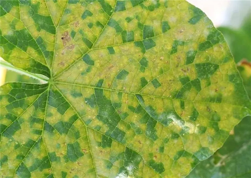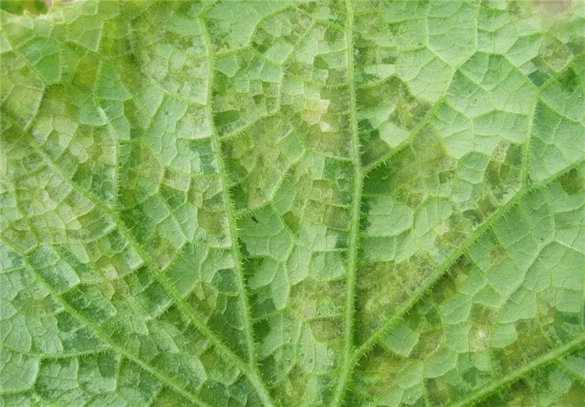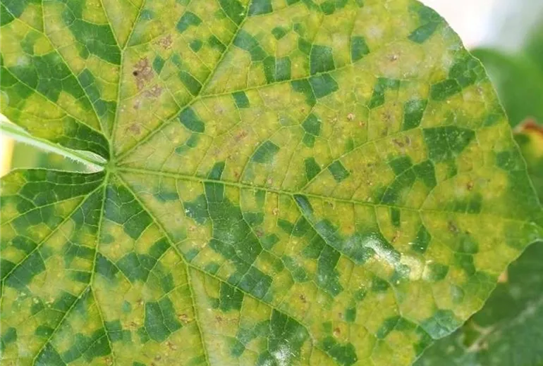 Im Sommer zeigen sich anfangs wässrige, kurz darauf, hellgrüne bis gelbbraune, durch die Blattadern begrenzte eckige Flecken auf den Blättern von Salat und Einlegegurken.