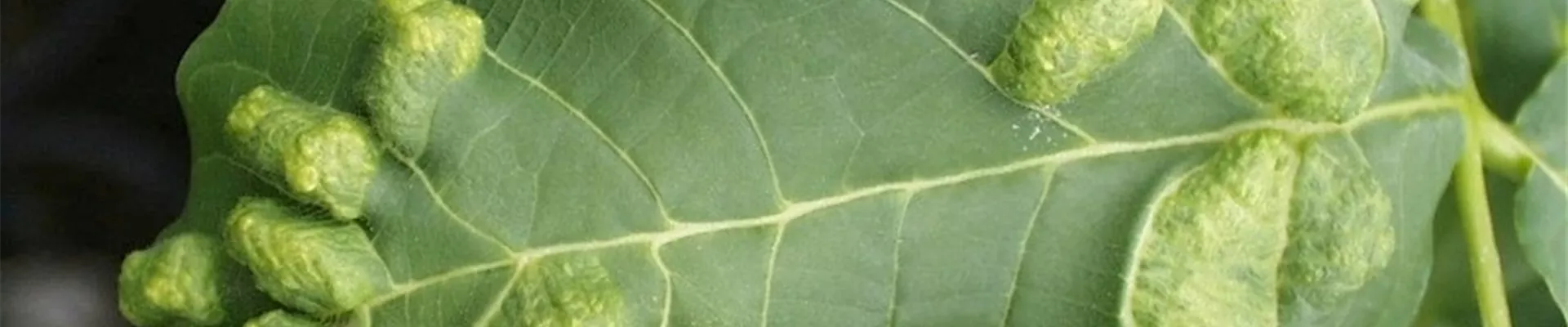 Auf den Blättern bilden sich blasige Aufwölbungen, deren Unterseite von einem weißlichen Haarfilz bedeckt ist, der sich später braun färbt.