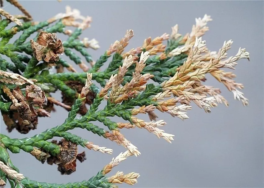 Neben Lebensbäumen zeigen auch Scheinzypressen (Chamaecyparis) und Wacholderarten (Juniperus) diese Absterbesymptome an den Trieben.