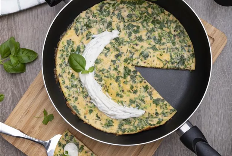 Zu der Frittata schmeckt ein leichter Kräuterdip oder Joghurtdip besonders lecker.