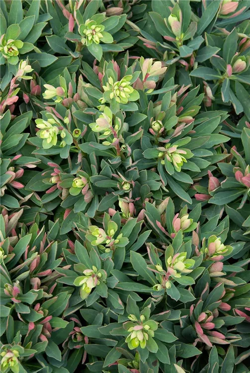 Die wintergrünen Blätter der Busch-Wolfsmilch 'Kolibri' sind grau-grün, lanzettlich.